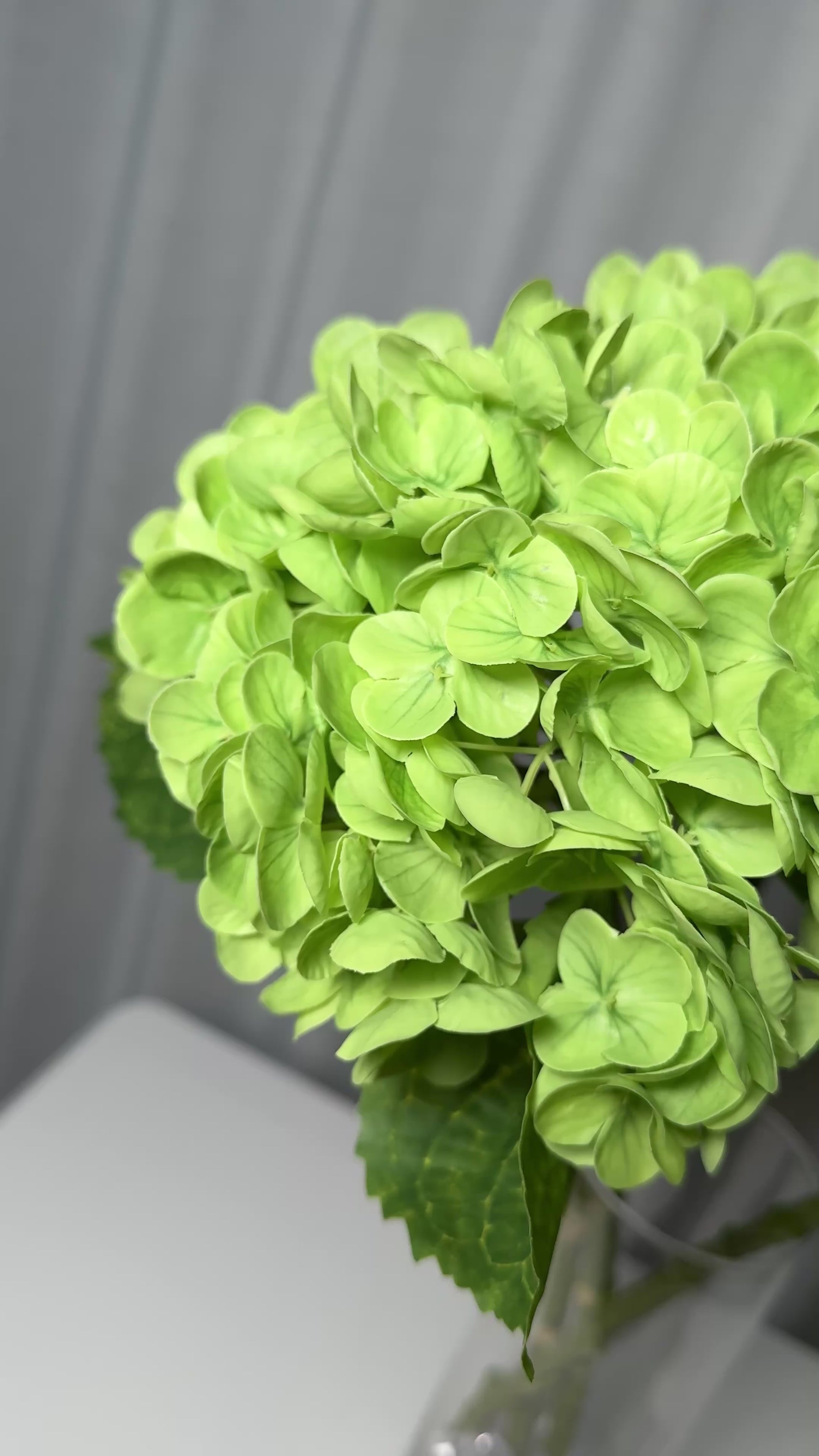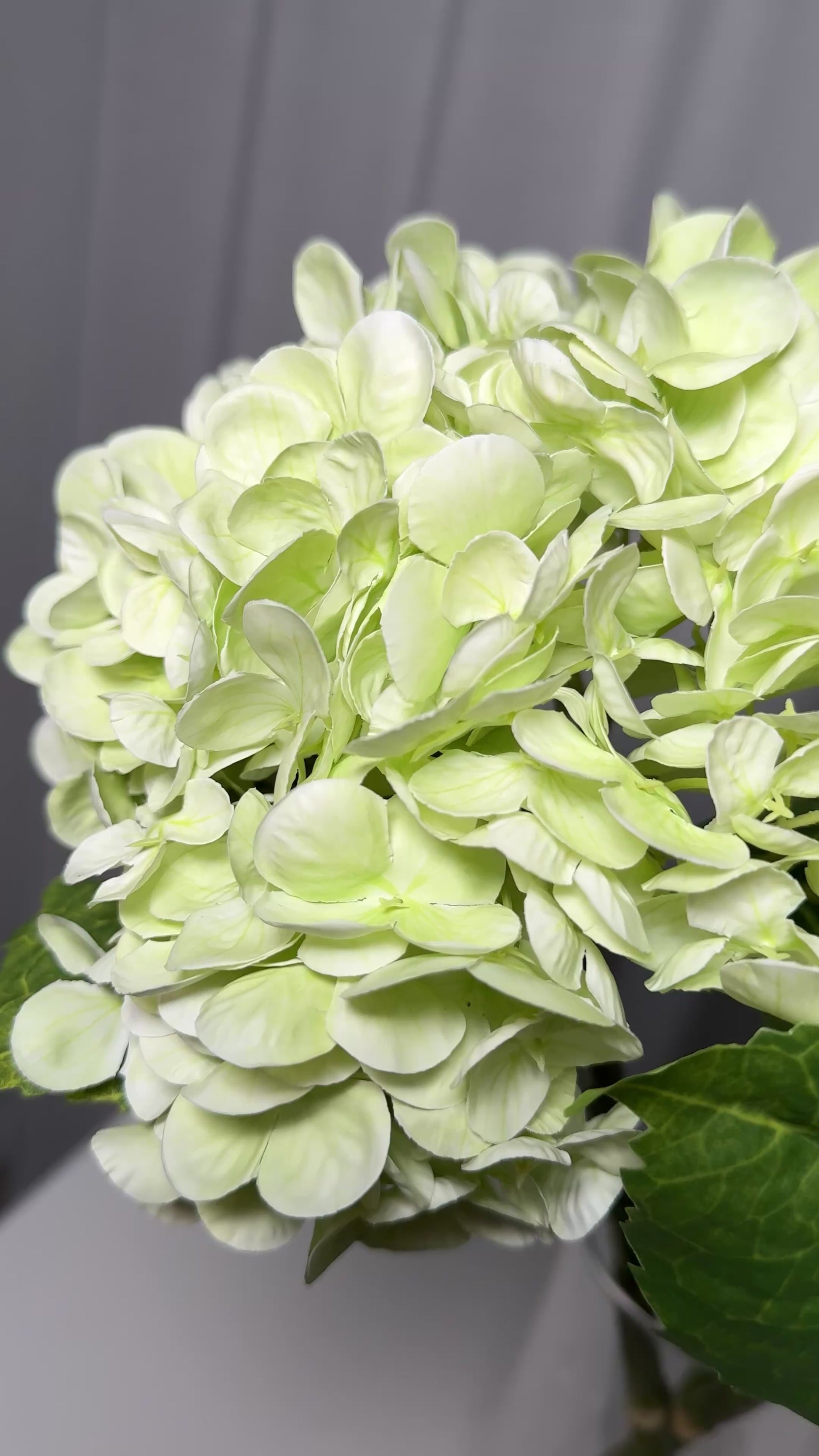 Soft, elegant green silk petals with subtle tonal variations mimic fresh hydrangeas perfect for adding an earthy, calming look to any space. -