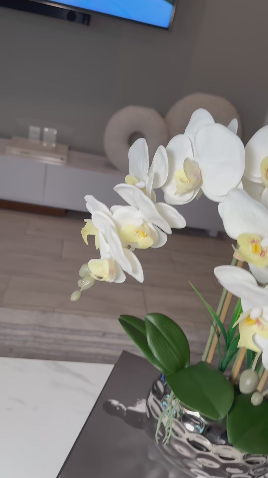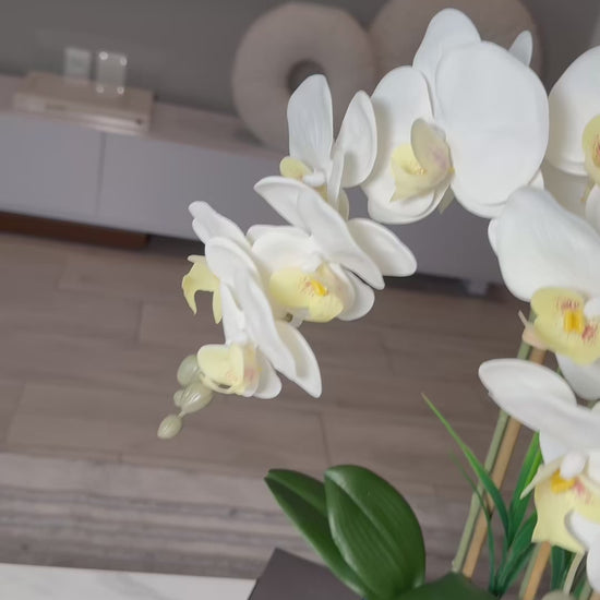 From Our Totally Glam Collection this stunning White Orchid Arrangement is the perfect addition to any space. The arrangement features a beautiful white orchid plant with multiple stems and blooms, all made with high-quality materials that look and feel like real flowers. The plant is set in a modern silver ceramic pot that complements the elegance of the orchids.