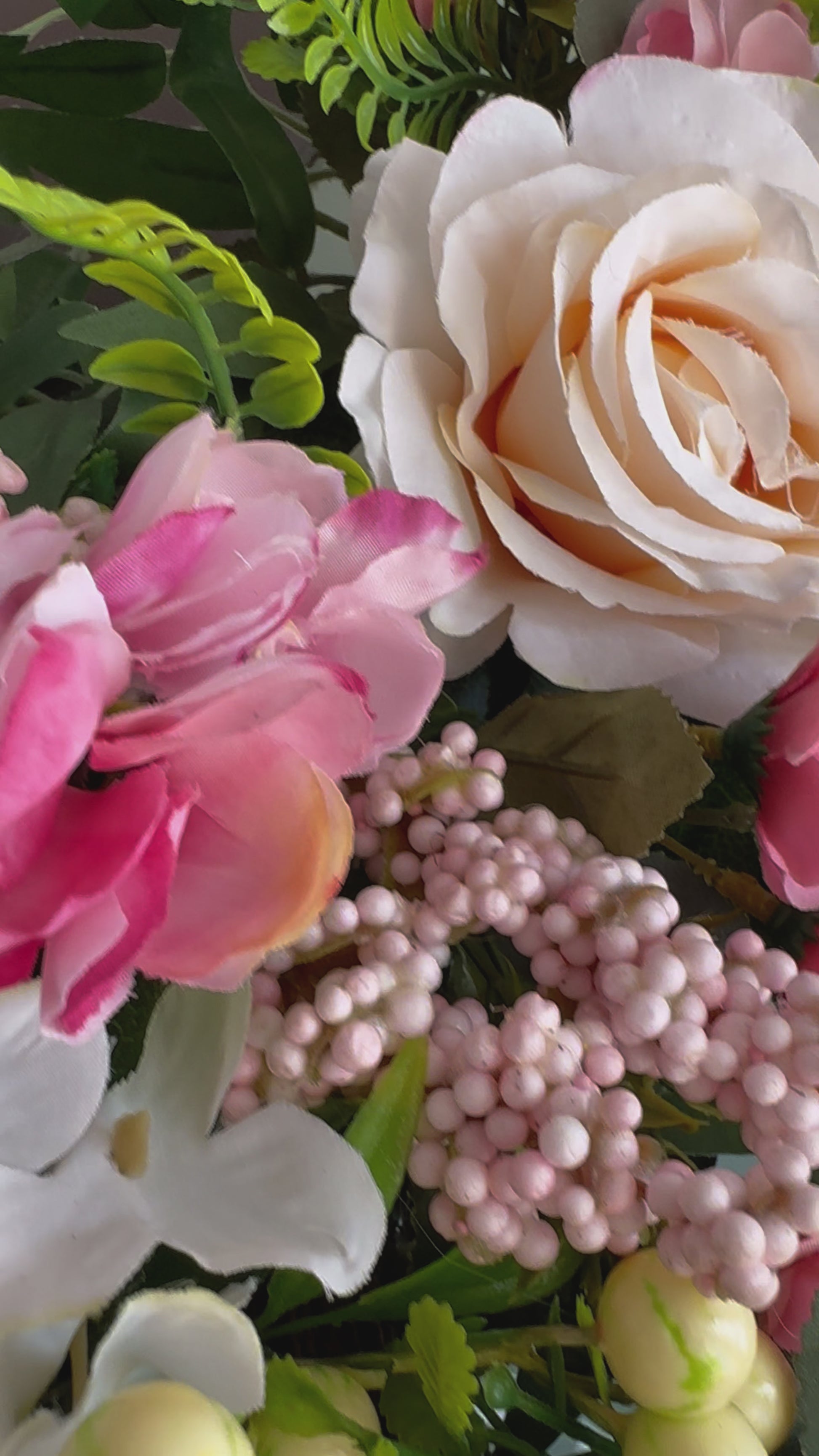 - Materials: Faux pink and blush roses, white hydrangeas, white berries, and green foliage