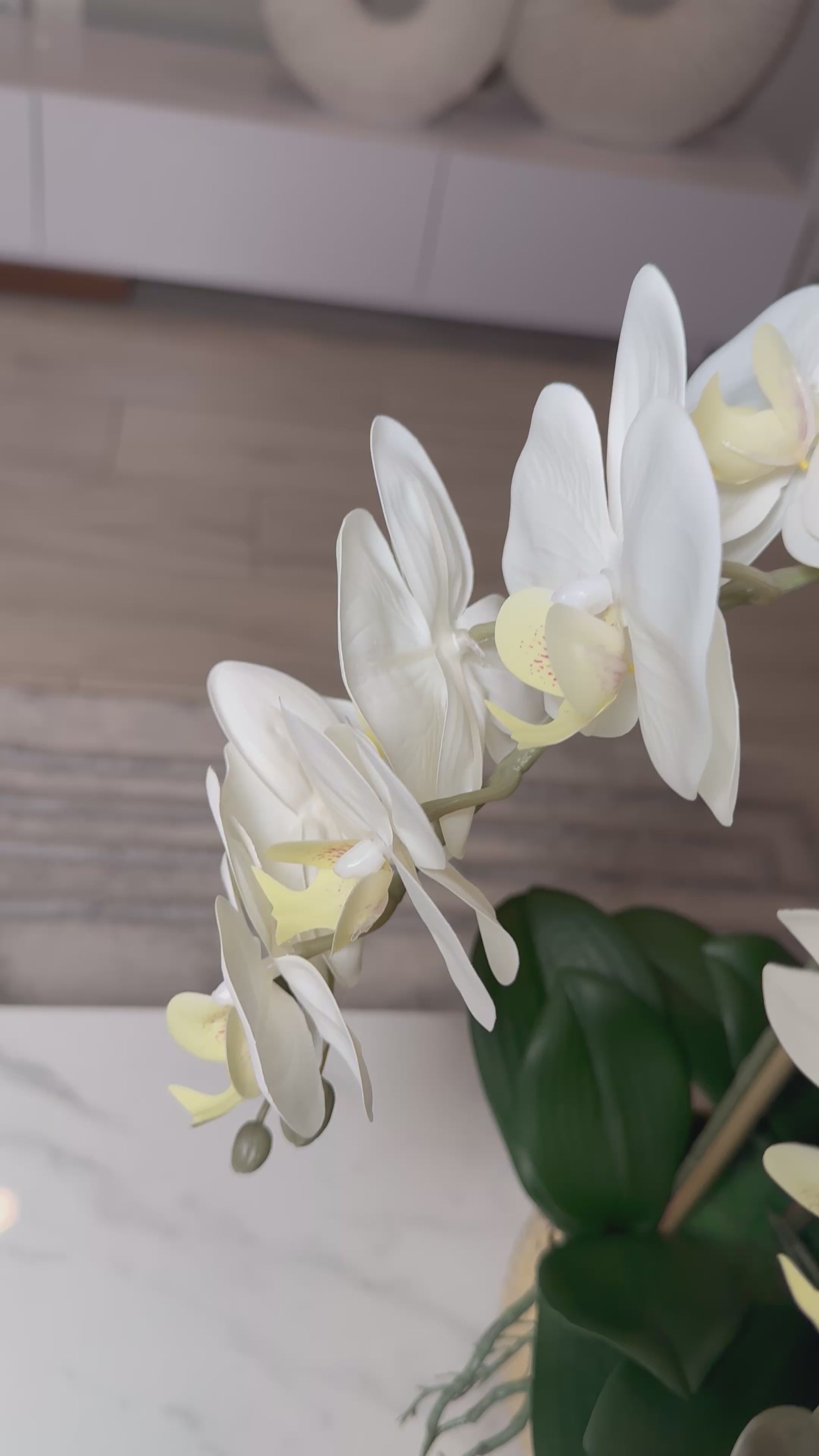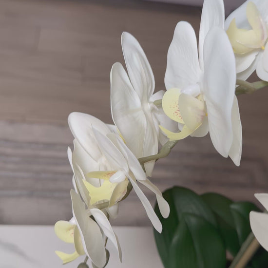 The vibrant green foliage complements the white orchids, making this arrangement a stunning and eye-catching display. The high-end real touch technology used in crafting the orchids ensures that they look and feel real. This arrangement is ideal for those who want the beauty of orchids without the maintenance required by real plants.